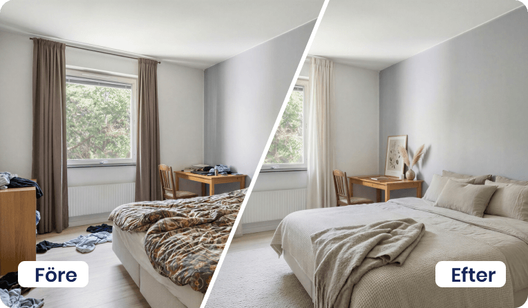 Vårt utbud av AI-tjänster hjälper dig att lyfta objekt, oavsett om det gäller bostäder till försäljning eller lokaler för uthyrning. Här finns lösningar för möblering, stilbyten, bild till film och borttagning av möbler eller bråte – allt som behövs för att skapa inspirerande och säljande material på nolltid.