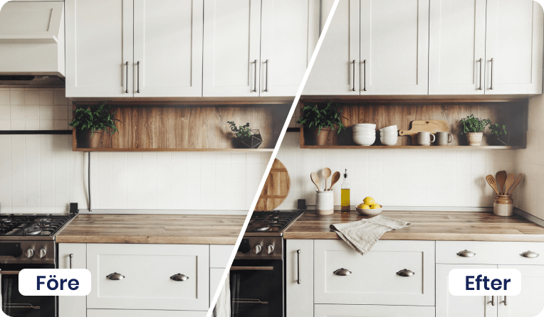 Med städa & styla förhöjer vi din bild genom att städa upp och lägga till utvalda detaljer som lyfter helheten. En stilren blomkruka, levande ljus, några fina kuddar eller en mjuk filt kan göra stor skillnad och ge rummet en mer inbjudande och harmonisk känsla.