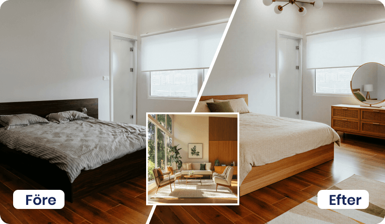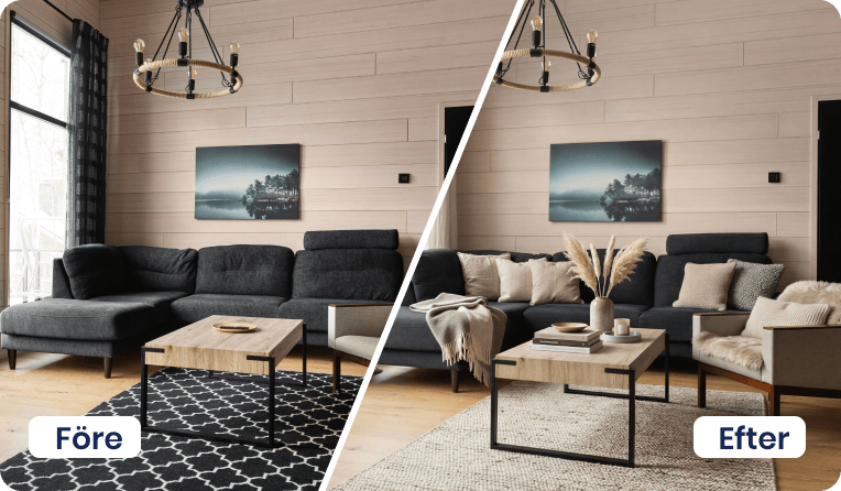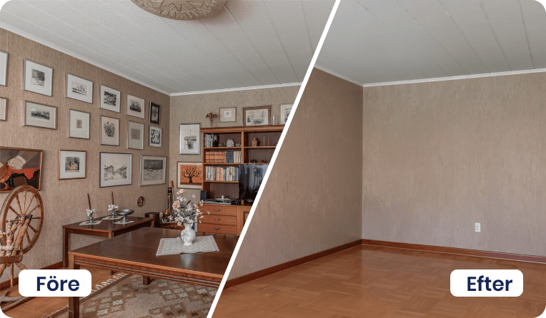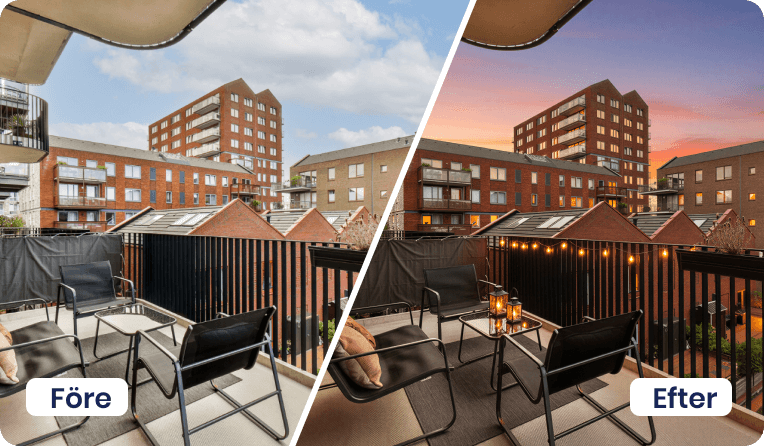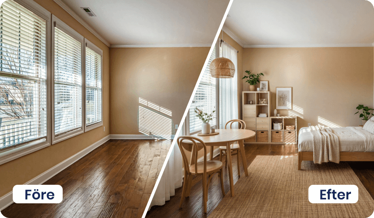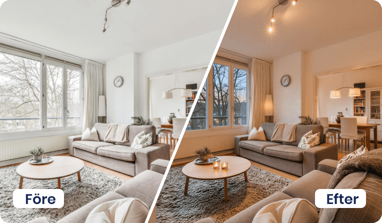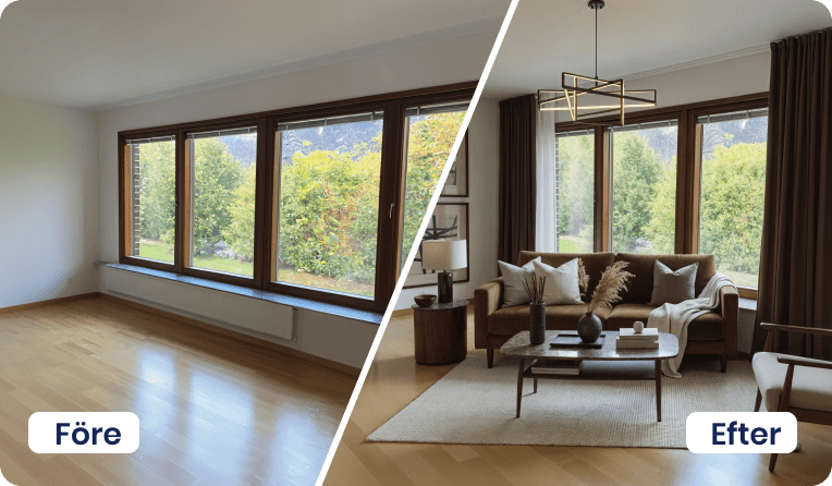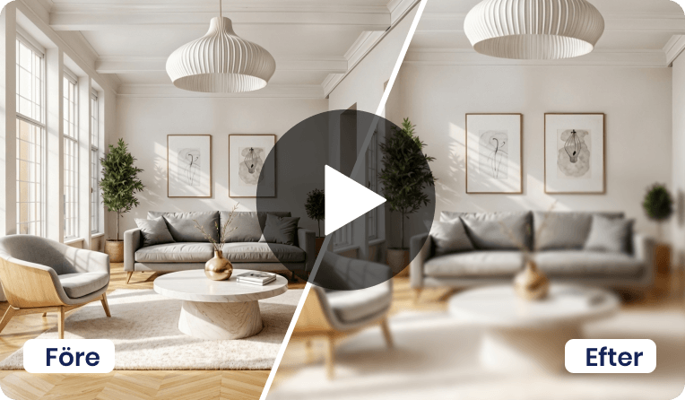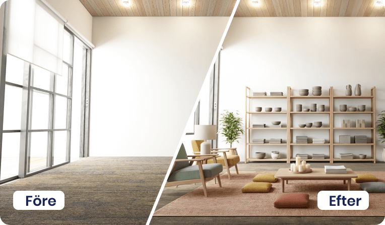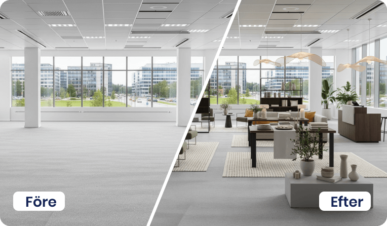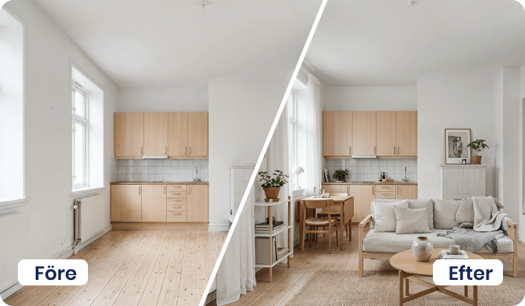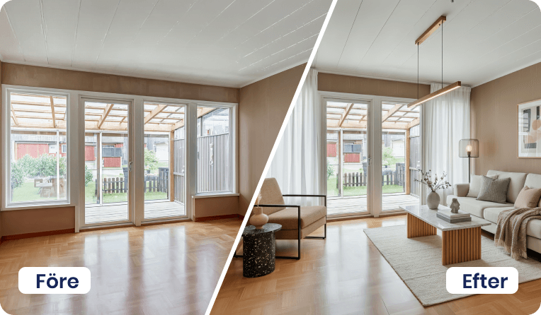 Vårt utbud av AI-tjänster hjälper dig att lyfta objekt, oavsett om det gäller bostäder till försäljning eller lokaler för uthyrning. Här finns lösningar för möblering, stilbyten, bild till film och borttagning av möbler eller bråte – allt som behövs för att skapa inspirerande och säljande material på nolltid.
