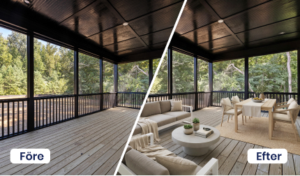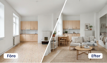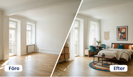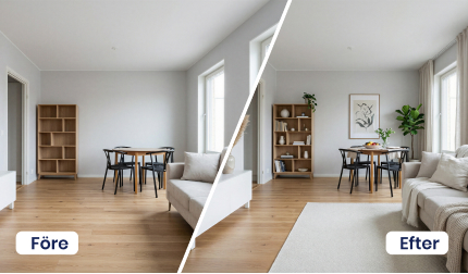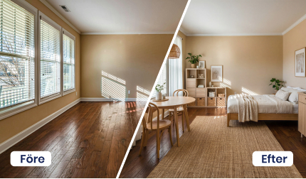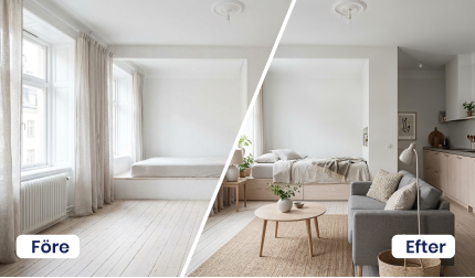 Vill du börja från noll och se rummet i sin mest rena form? Med funktionen Ta bort möbler kan du trolla bort befintlig inredning samt enkelt plocka bort oreda och stök. Du får en tydlig överblick över ytor, proportioner och möjligheter – en perfekt utgångspunkt inför nästa steg, när du vill visualisera nya idéer, planera ommöbleringar, testa renoveringsprojekt eller utforska helt nya inredningslösningar med vår AI. En smart funktion för både hemmet, kontoret och offentliga miljöer.