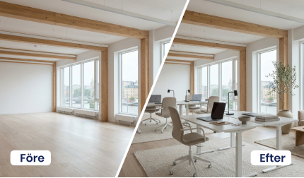 Se en bostad eller lokal i ett helt nytt ljus. Testa olika möbleringar, färger och stilar och skapa inspirerande visualiseringar, perfekt inför uthyrning eller försäljning. Skapa ett hemtrevligt vardagsrum, planera om sovrummet eller testa hur en ny matgrupp skulle passa i köket - allt digitalt, snabbt och smidigt.