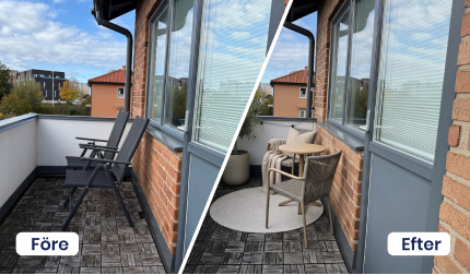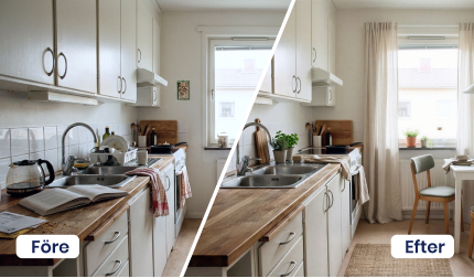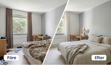 Vill du lyfta helhetsintrycket utan att göra om allt från grunden? Med funktionen städa & styla förhöjer vi din bild genom att varsamt städa upp och samtidigt lägga till genomtänkta detaljer som skapar en mer inbjudande känsla. Det kan vara att lägga på ett överkast på en obäddad säng, komplettera med en blomkruka, snygga prydnadskuddar, en filt och levande ljus.