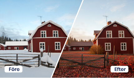Upplev hur rummet får nytt liv när ljuset förändras. Genom att anpassa belysning och inredning skapas en unik atmosfär som väcker känslor, förstärker upplevelsen och ger en annan känsla av mys och hem. Små förändringar i ljus och färg kan förvandla ett rum och ge karaktär, värme och dynamik som engagerar och inspirerar. Med denna funktion speglas även årstidens skiftningar och vädrets olika nyanser. Det här gör att du inte behöver anlita en ny fotograf om objektet är kvar nästa säsong, utan det löser vår AI åt dig med den befintliga bilden.